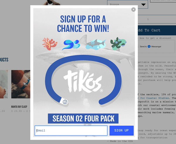 Splish Splash Swimwear uses a Klaviyo pop-up that is set up to appear after a time delay. You can also use an exit-intent pop-up that appears when a visitor is about to leave the site.