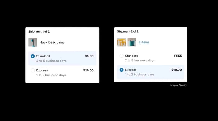 Split shipping in checkout: show customers when orders ship in multiple deliveries and let them choose (e.g., fastest, cheapest) shipping.